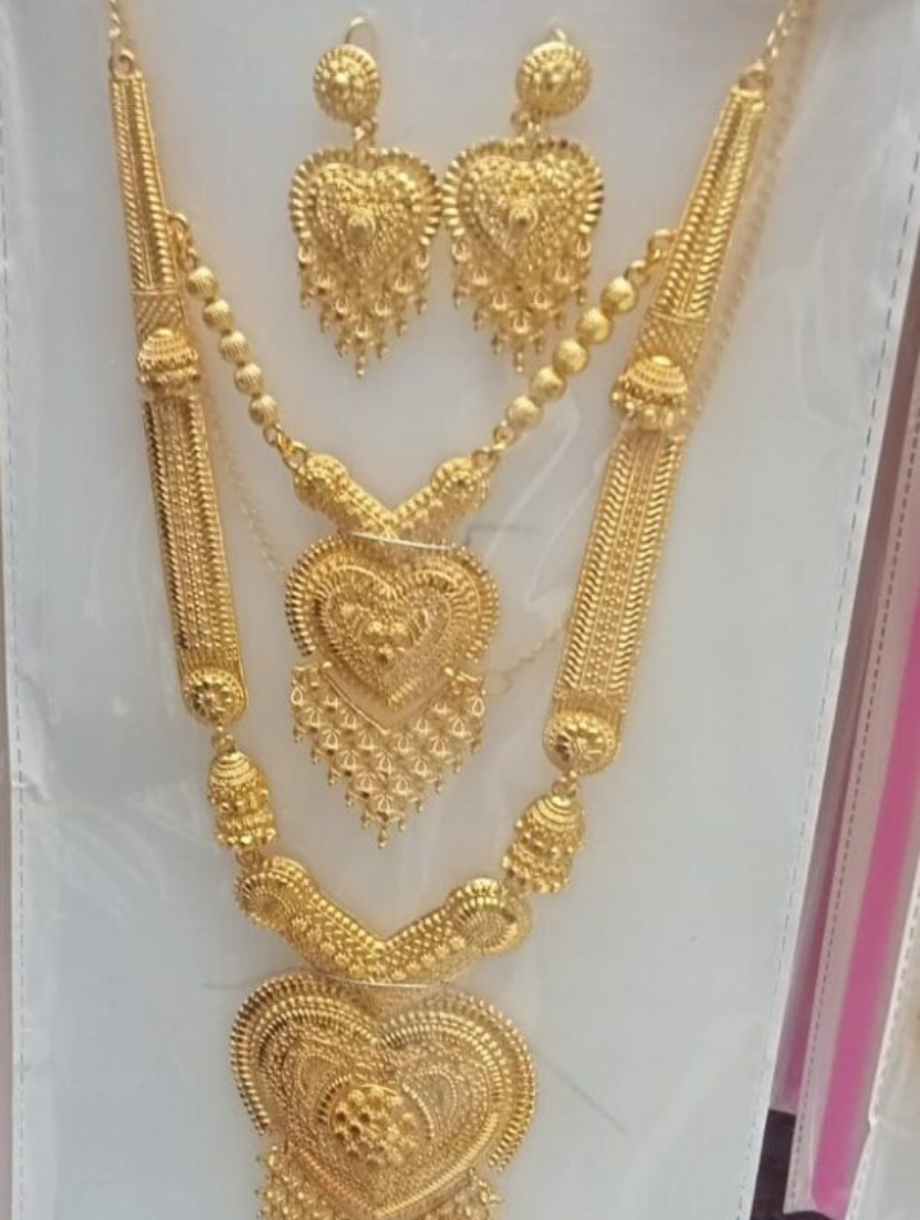 This “Rani Haar” from Rich Jewellers is a stunning example of traditional artistry designed to make you feel like royalty. The set features a unique layered design, with a shorter necklace nestling a medium-sized heart pendant, followed by a grand, long-chain necklace holding a large, intricately detailed heart-shaped focal point. Every heart is adorned with delicate filigree and textured golden patterns that capture the light beautifully. The long chain is accented with traditional golden beads and structured elements, leading down to a magnificent fringed finish on the main pendant. Accompanied by matching oversized heart drop earrings, this set is gold-plated to provide a high-end, authentic look for weddings, anniversaries, or grand festive occasions.